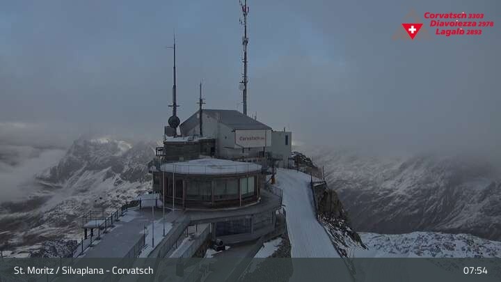 Die Webcam zeigt einen tollen Panoramablick von der Bergstation der Seilbahn am Corvatsch auf den Silvaplanersee.