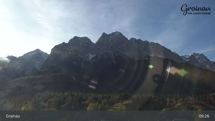 Die Live-Webcam zeigt vom Freibad aus einen Rundumblick auf das Bergdorf Grainau und seine Umgebung. Zu sehen sind unter anderem die Zugspitze, der große und kleine Waxenstein sowie der Hohe Ziegspitz.