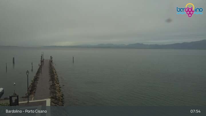 Die Kamera befindet sich am Strand Lido Mirabello und blickt nach Norden auf den Hafen von Bardolino am Gardasee.