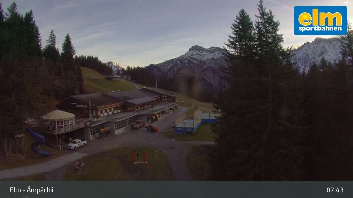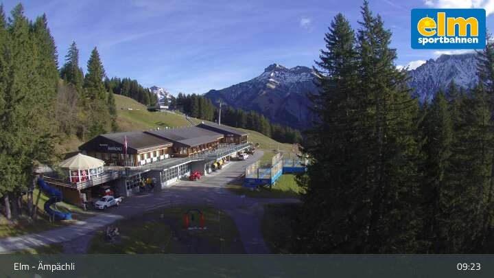 Die Webcam zeigt das Bergrestaurant Ämpächli in Elm. Es erwartet seine Besucher täglich während der Betriebszeiten der Gondelbahn Elm - Ämpächli mit einer Pasta-Station, Salatbuffet und Tagesangeboten.