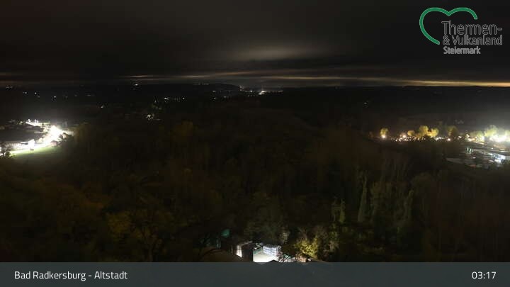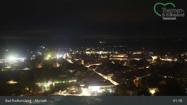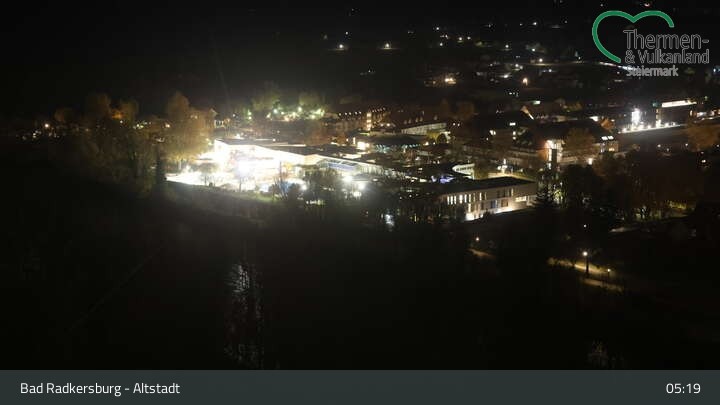 Hier blickst du auf die historische Altstadt von Bad Radkersburg. Du kannst die Stadtpfarrkirche und die Frauenkirche erkennen. Davor befindet sich die Mur, die die Grenze zu Slowenien bildet.