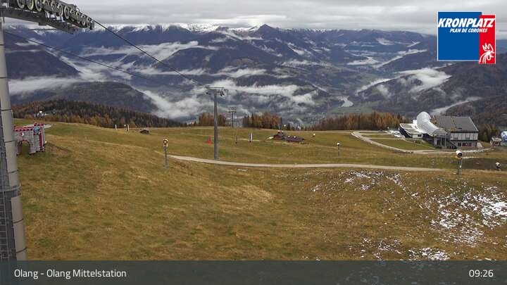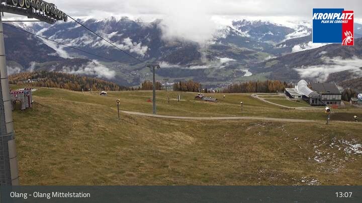 Hier siehst du die Mittelstation der Gondel Olang sowie die umliegende Bergwelt von Kronplatz.
