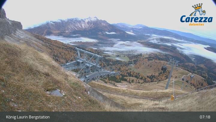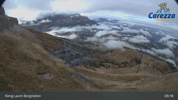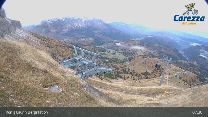 Die Webcam eröffnet von der Kölner Hütte das Panorama zum Latemar. Du siehst hier auch gut die neue König Laurin Gondelbahn mit unterirdischer Bergstation.