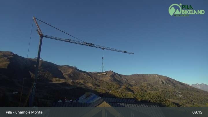 Die Webcam befindet sich an der Bergstation des Chamolé Sessellifts und blickt über die Berge des Aostatals.
