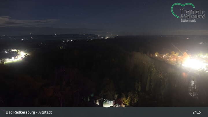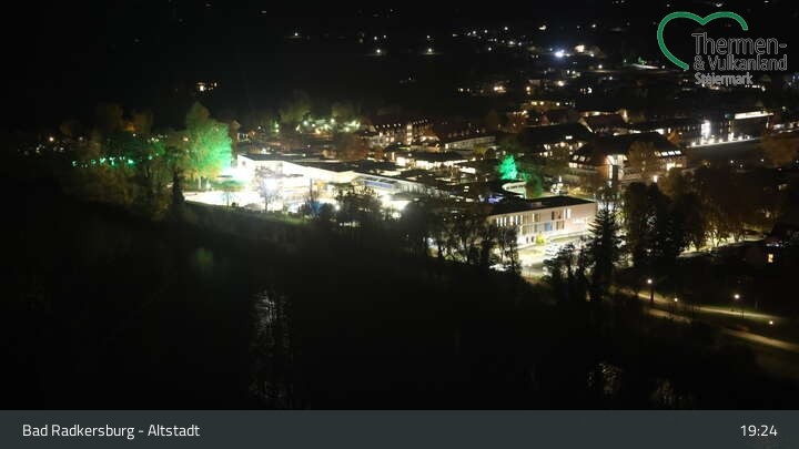 Hier blickst du auf die historische Altstadt von Bad Radkersburg. Du kannst die Stadtpfarrkirche und die Frauenkirche erkennen. Davor befindet sich die Mur, die die Grenze zu Slowenien bildet.