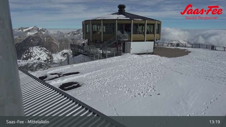 Diese Webcam auf dem Mittelallalin, einem Nebengipfel des Allalinhorns in Saas-Fee zeigt das Drehrestaurant, von dem aus man die Aussicht auf die umliegenden Walliser Alpen genießen kann.