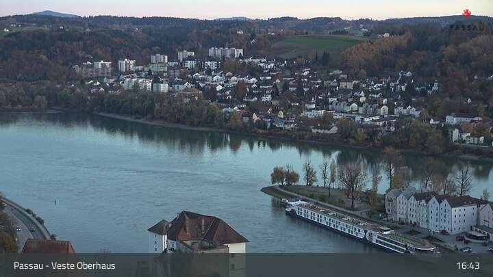Die Webcam zeigt dir den Blick von der Veste Oberhaus über die Donau zur Altstadt der niederbayerischen Stadt Passau. Sehr gut zu erkennen sind links Teile der Burgveste, die Ortspitze wo die drei Flüsse Donau, Inn und Ilz zusammenfließen, die Hängebrücke über die Donau und rechts der weiße Stephansdom.
