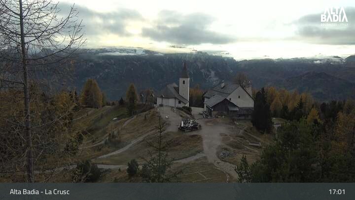 Blick von der Bergstation des La Crusc Sessellifts auf die Berge rund um Alta Badia. Die kleine Kirche ist ein beliebtes Wallfahrtsziel.