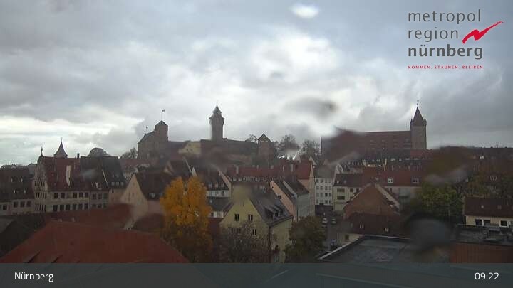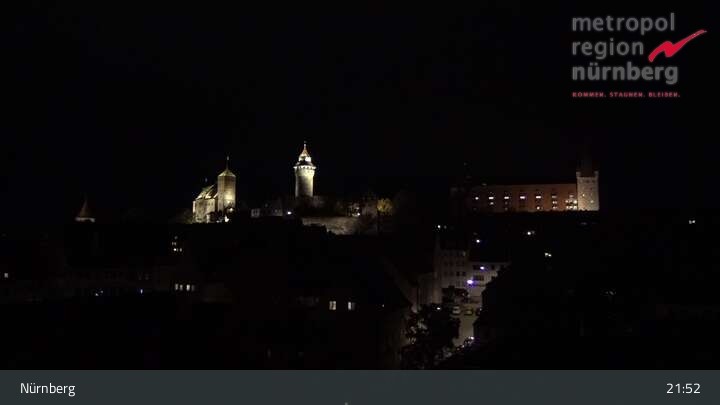 Blick über die Dächer Nürnbergs, die zweitgrößte Stadt Bayerns. Die Kamera ist in der Theresienstraße in der Altstadt positioniert und zeigt unter anderem die Kaiserburg, das Rathaus und das Staatstheater.