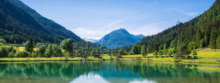 Rund um den Badesee Flachauwinkl gibt es zahlreiche Anlagen, die für jede Menge Spaß und Action sorgen. So kannst du gemeinsam mit Freunden eine Runde Beachvolleyball spielen. Die kleinen Wasserratten freuen sich über den Erlebnisspielplatz mit Piratenschiff und einen Streichelzoo. Hier kannst du sogar Ponyreiten. Ein echtes Highlight ist der neue Hochseilklettergarten mit einem Flying Fox über den See. Rund 20 Hindernisse in einer Höhe zwischen neun und zwölf Metern gilt es zu überwinden.