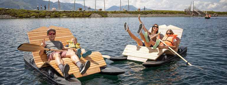 Mit Schwimmstegen, Bootsverleih, Genussnischen, einem Niedrigwasserbereich für die Kleinen, einer Schwimminsel und vielem mehr verspricht der Fichtensee auf der Rosenalm jede Menge Spaß und Action.