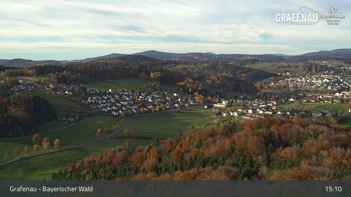 Genieße den Ausblick auf den Luftkurort Grafenau im Bayerischen Wald. Die Kamera befindet sich südlich der Stadt und blickt nach Norden über die Stadt zum Nationalpark Bayerischer Wald.