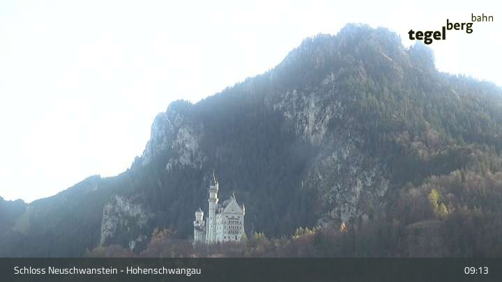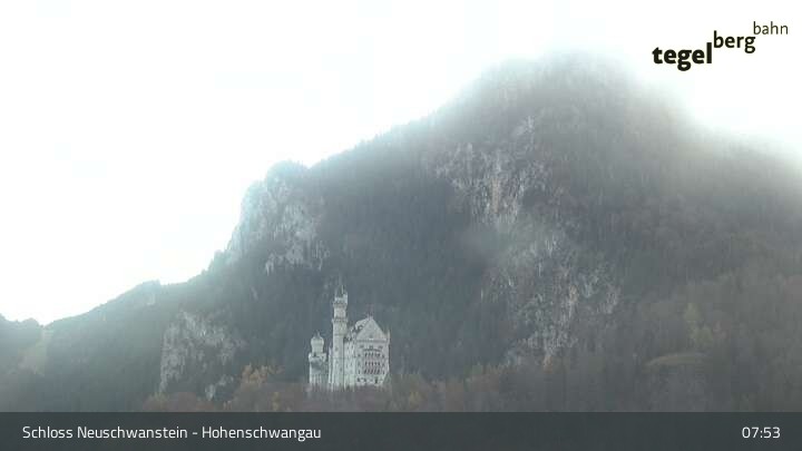 Die Kamera befindet sich am Schloss Hohenschwangau und schwenkt vom Schloss Neuschwanstein zum Museum der Bayerischen Könige.
