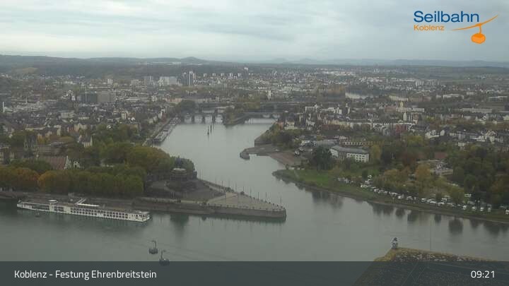 Webcam Koblenz: Blick von der Festung auf Seilbahn und Deutsches Eck, 160 m