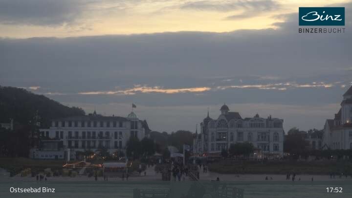 Zu sehen ist die Strandpromenade des Ostseebades Binz. Die Webcam ist auf der Seebrücke Binz positioniert und zeigt unter anderem Kurhaus, Strandpromenade und den Fischerstrand.