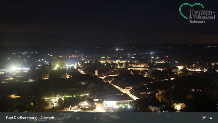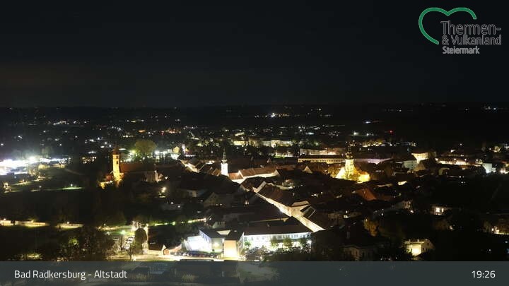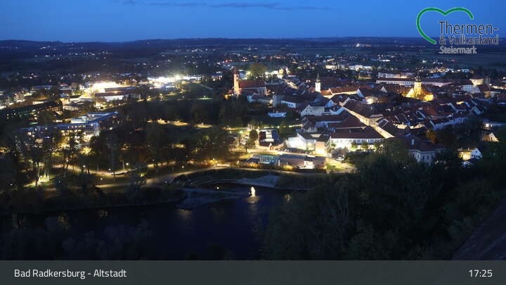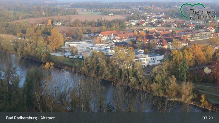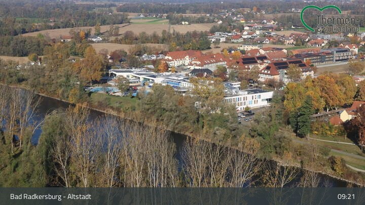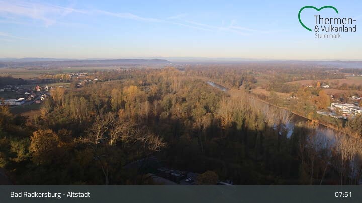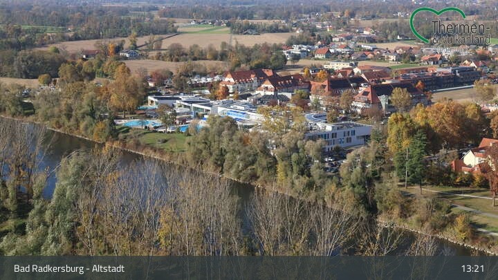 Hier blickst du auf die historische Altstadt von Bad Radkersburg. Du kannst die Stadtpfarrkirche und die Frauenkirche erkennen. Davor befindet sich die Mur, die die Grenze zu Slowenien bildet.