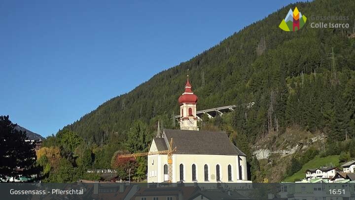 Die Kamera zeigt die Kirche Parrocchia San Valentino in Gossensass im Eisacktal.