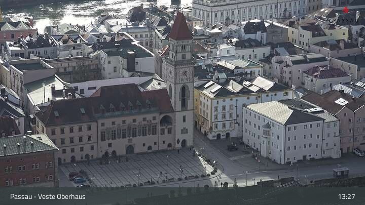 Die Webcam zeigt dir den Blick von der Veste Oberhaus über die Donau zur Altstadt der niederbayerischen Stadt Passau. Sehr gut zu erkennen sind links Teile der Burgveste, die Ortspitze wo die drei Flüsse Donau, Inn und Ilz zusammenfließen, die Hängebrücke über die Donau und rechts der weiße Stephansdom.