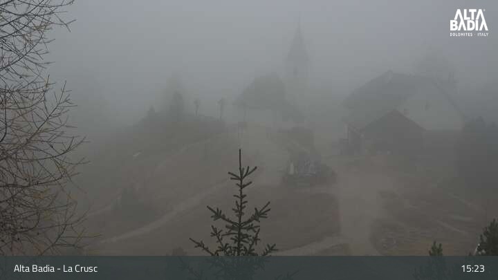 Blick von der Bergstation des La Crusc Sessellifts auf die Berge rund um Alta Badia. Die kleine Kirche ist ein beliebtes Wallfahrtsziel.