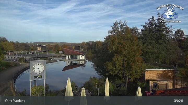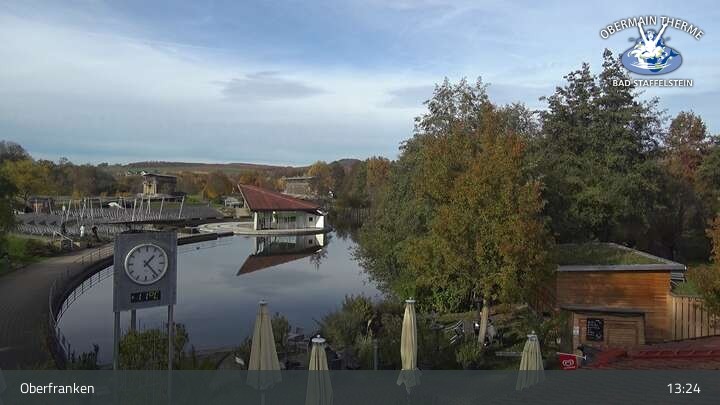 Blick auf die Seebühne im Bad Staffelsteiner Kurpark in Oberfranken. In den Sommermonaten wird hier ein Mix aus Konzerten und Veranstaltungen geboten.
