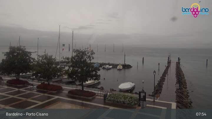 Die Kamera befindet sich am Strand Lido Mirabello und blickt nach Norden auf den Hafen von Bardolino am Gardasee.