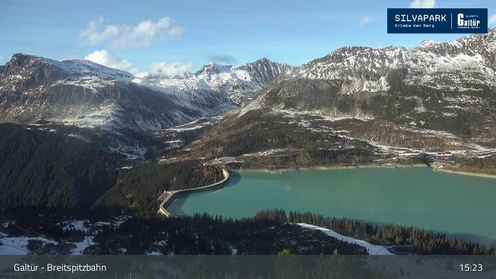 Die Webcam an der Breitspitzbahn in Galtür blickt auf die umliegende Bergwelt.